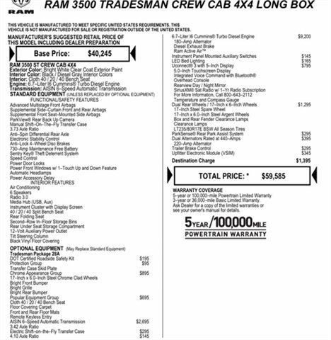 2018 RAM 3500 TRADESMAN, 6.7 CUMMINS 4X4 AISIN 6–Speed Automatic Trans (27,051 ORIGINAL MILES)